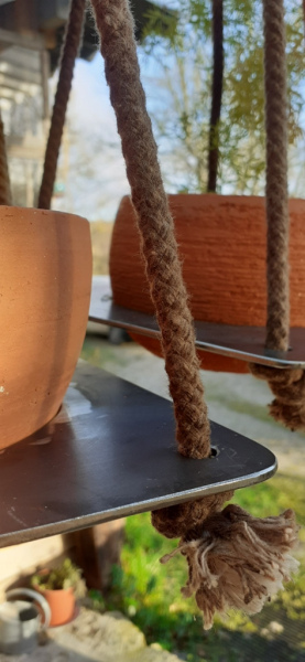 Les liens sont de la corde naturelle issue d'une corderie française.Ils sont ajustables en longueur grâce aux noeuds coulants 'sauf pour la compo duo, les hauteurs sont fixes.