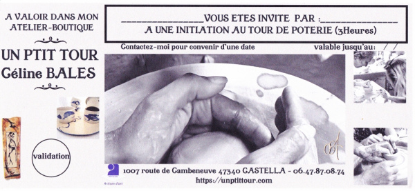 Cette carte initiation offre une 1/2 journée sur un tour de potier dans mon atelier boutique à Castella, situé entre Villeneuve sur Lot et Agen (Lot et Garonne) pour: