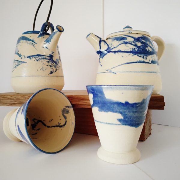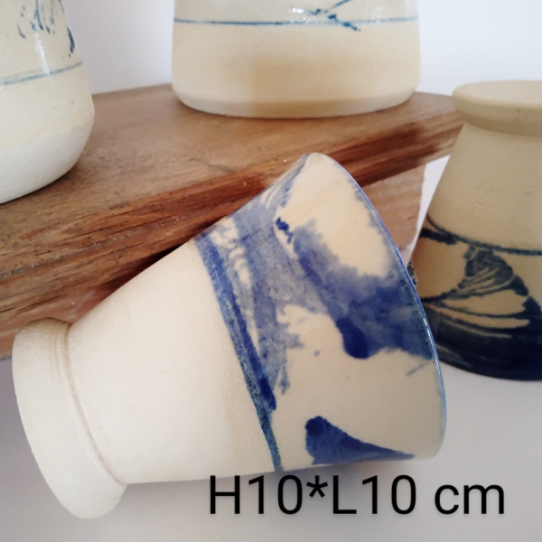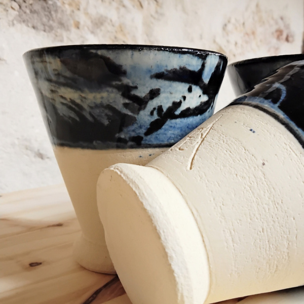 Tasses coniques semi émaillées en grès blanc.